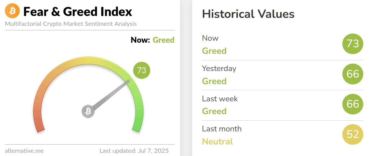 7月7日,Alternative.me数据显示,加密货币恐慌与贪婪指数升至73(前值66),显示当前市场处于「贪婪状态」。