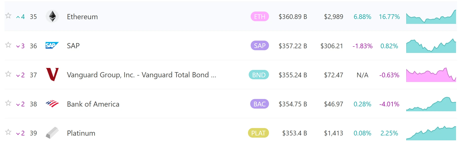以太坊市值突破3755亿美元,全球资产排名跃居第30位