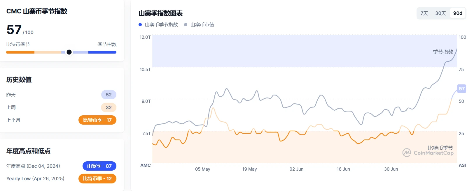 7月21日,TradingView数据显示比特币市占率降至60.86%,创今年3月3日以来新低。 Coinmarketcap数据显示,山寨币季节指数(Altcoin Season Index)现报57,较上周均值上涨25点,涨幅达78%。该指数显示过去90天市值前100加密货币中57个项目涨幅超越比特币。 CMC加密货币山寨季指数通过对比前100大山寨币与比特币的90日表现,实时反映市场主导状态。