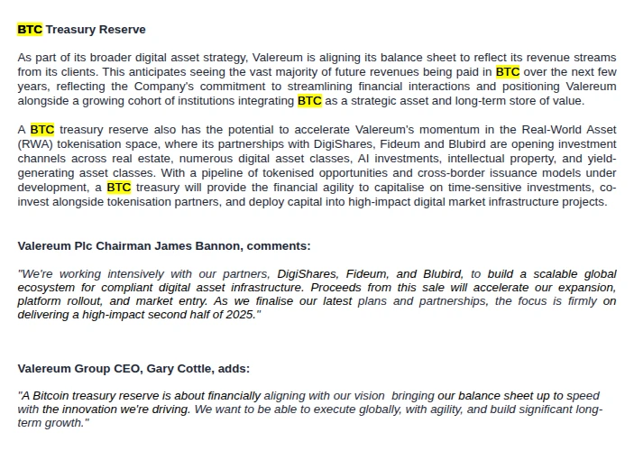英国上市公司Valereum于8月1日宣布,拟通过增发1,612.9万股普通股募集50万英镑专项资金,用于加速推进其增长战略。公司将重点建设数字金融市场基础设施平台,并同步启动比特币储备金建设计划。值得注意的是,企业预测未来主要营收将采用比特币结算方式,该规划与其在实物资产代币化领域的战略部署形成直接关联。