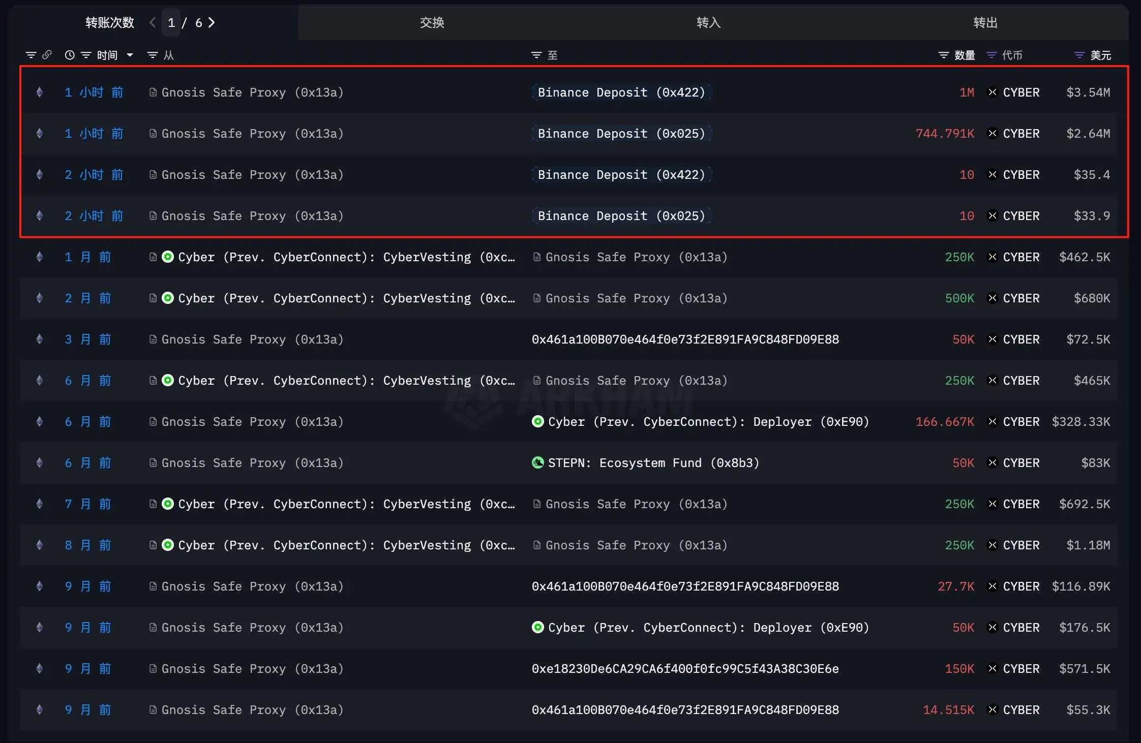 8月12日,Cyber多签钱包向币安转入174.4万枚CYBER,价值约618万美元。
