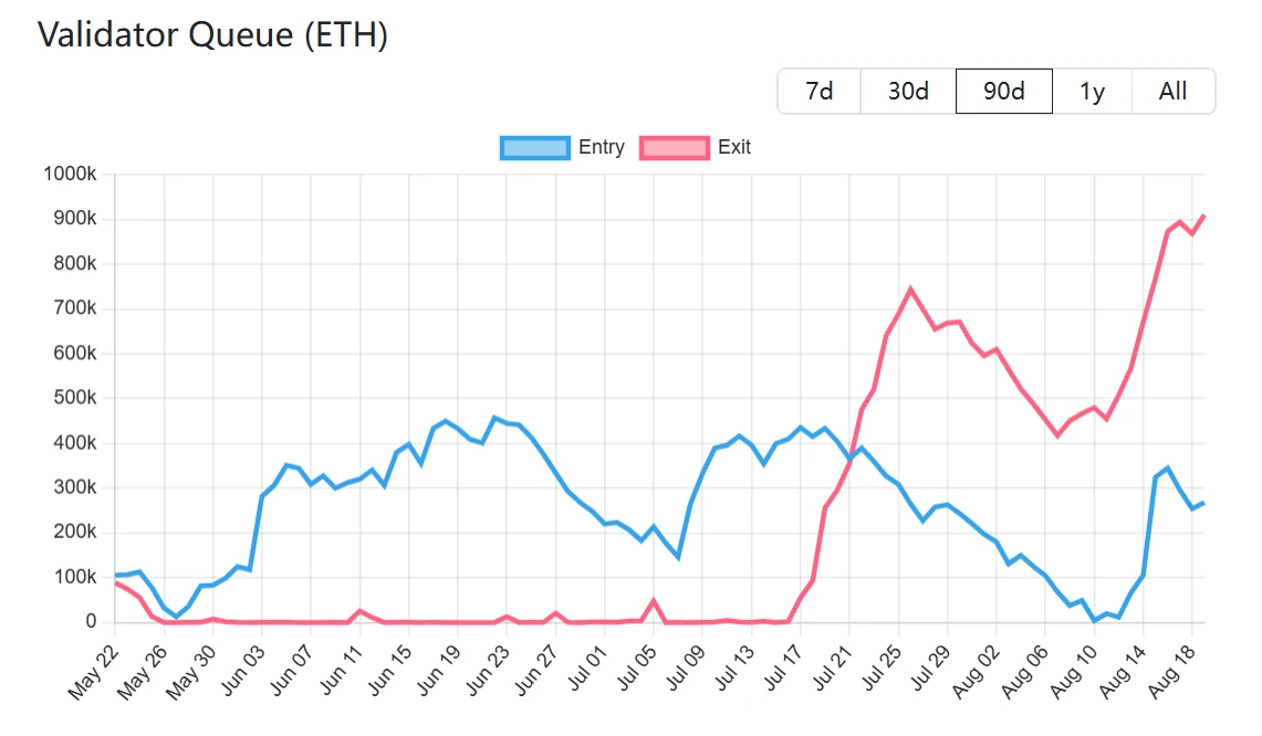 以太坊PoS网络ETH退出队列规模于8月19日再创新高,当前待退出总量达910,461枚,按现价计算约合39.1亿美元。数据显示该指标已连续7日呈增长趋势,当前平均退出等待周期为15天19小时。同期网络新增质押ETH待激活量达268,217枚,价值约11.5亿美元,预计需等待4天16小时完成节点激活。