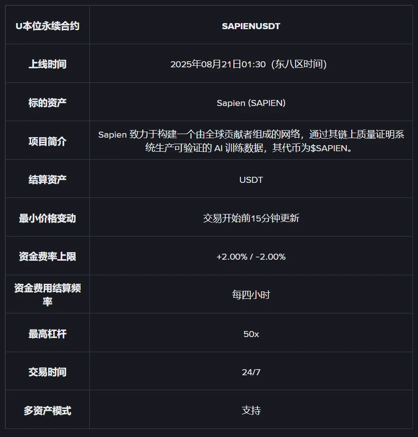 币安官方公告显示,Sapien(SAPIEN)代币将于2025年8月21日01:00(UTC+8)在币安Alpha平台上线交易,同日01:30(UTC+8)币安合约平台将推出SAPIEN/USDT永续合约产品,支持最高50倍杠杆交易。值得注意的是,币安成为首家同时开放该代币现货交易及合约交易的平台,并配套推出独家代币空投活动:2025年8月21日01:00至8月22日01:00期间,符合条件的用户可通过币安Alpha活动页面使用平台积分领取空投奖励。