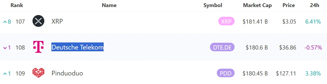 8月23日,XRP价格突破3美元关口,最高触及3.05美元,24小时涨幅达6.41%。根据8MarketCap最新统计,该资产当前市值已攀升至1814.1亿美元,超越拼多多(1840.5亿美元)和德国电信,在全球资产市值排名中位列第107位。