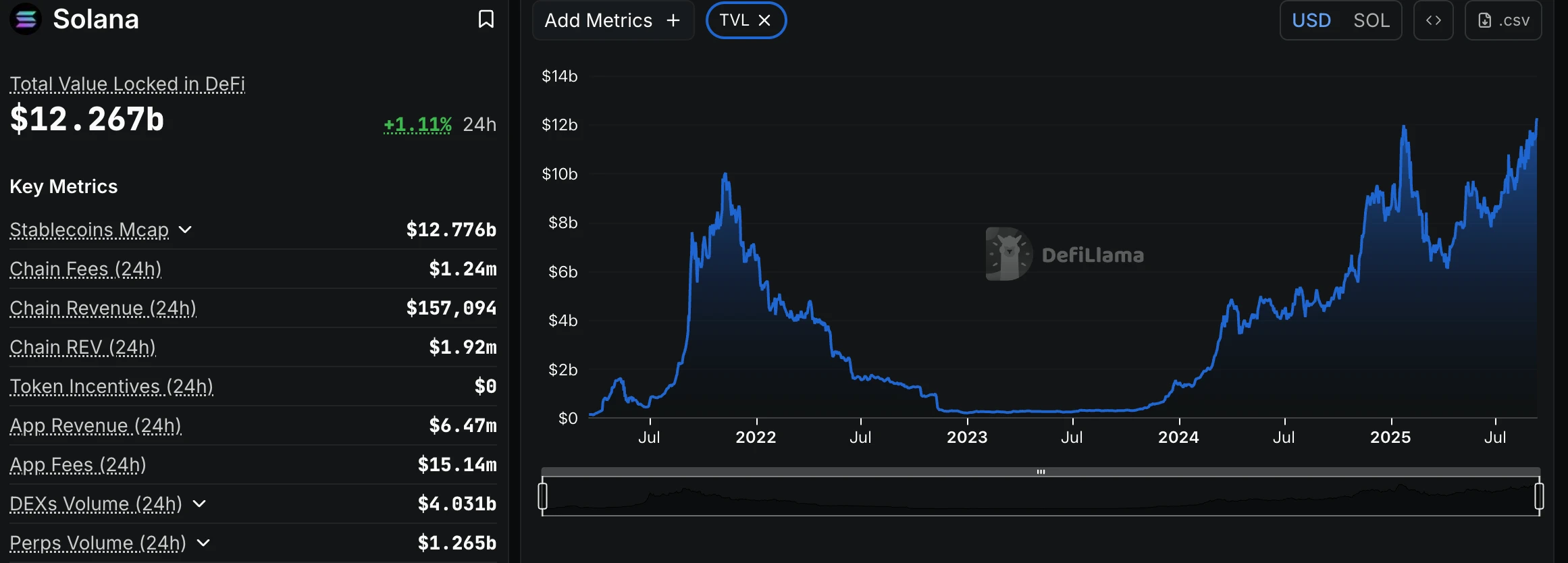 9月10日,Coinmarketcap数据显示Solana市值逼近1200亿美元,24小时涨幅达0.94%。DefiLlama数据则显示,Solana生态DeFi总锁仓量突破122.67亿美元,创历史新高。