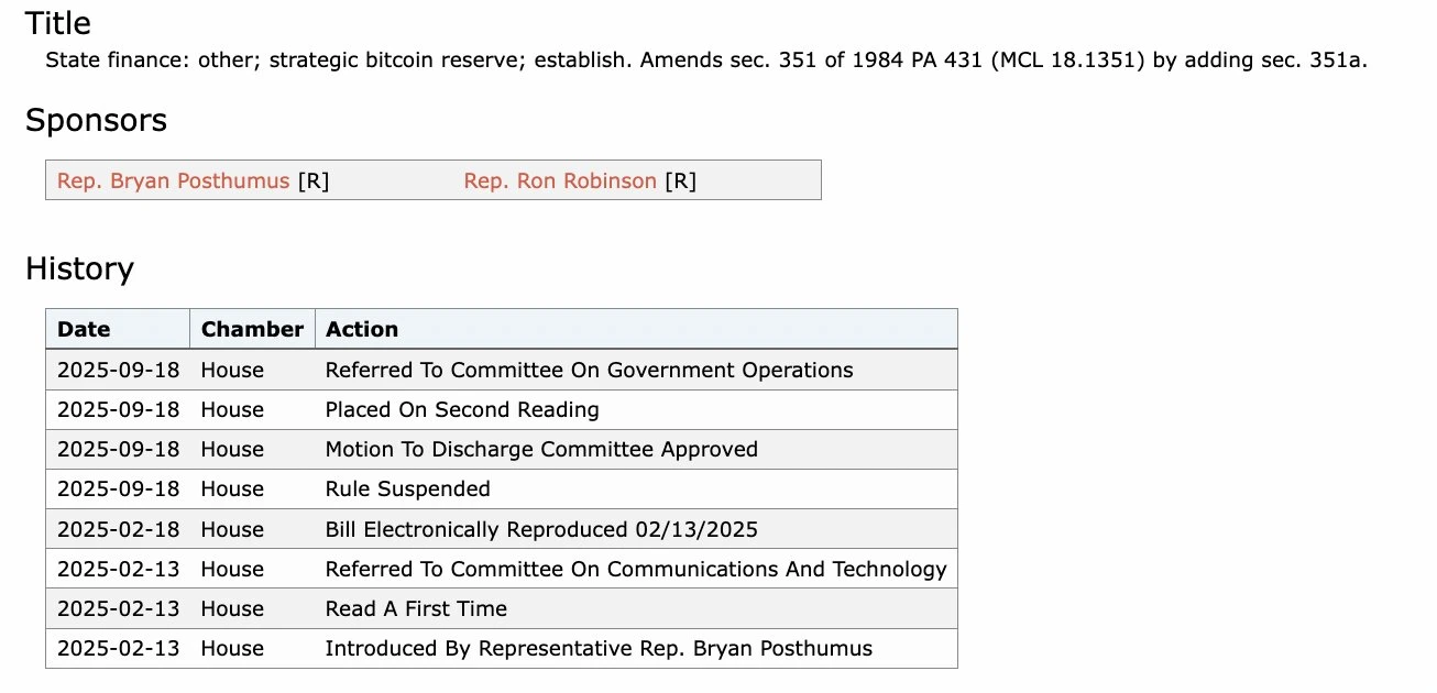 密歇根州比特币储备法案HB 4087于9月19日取得关键进展,该法案在停滞7个月后正式进入众议院二读阶段,并同步提交至政府运营委员会进行实质审议。根据法案核心条款,州政府将获得最高配置10%州资金至加密货币资产的法定权限。