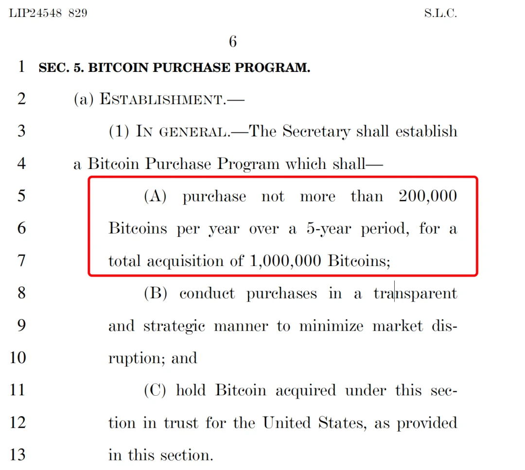 法案规划了为期五年的比特币收购计划,每年购入不超过20万枚BTC,五年累计达100万枚,约占比特币总供应量的5%。这种渐进式收购旨在最小化市场冲击,同时为美国构建长期金融对冲工具。