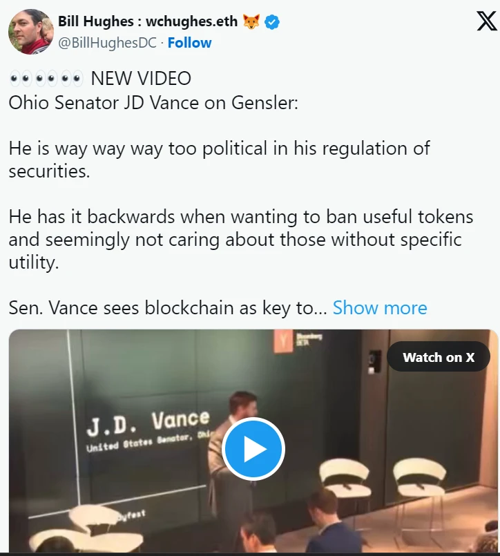 特朗普竞选搭档JD Vance在今年2月公开批评SEC主席Gary Gensler,称他是监管加密资产的"最糟糕人选"。Vance指责Gensler在加密货币政策上采取落后且过度政治化的监管方式,这种强硬立场引发了行业广泛争议。
