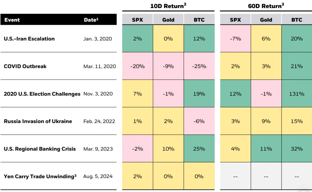 作为首个去中心化、非主权的货币替代品,比特币不依赖任何中心化系统,也不受单一国家经济状况驱动。这种特性使其天然免疫于银行系统危机、主权债务危机、货币贬值等地缘政治风险。历史数据表明,在重大地缘冲突事件中,比特币往往在短暂下跌后快速反弹,最终表现优于传统资产。