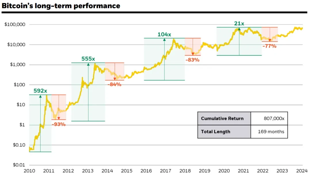 比特币在过去十年中展现出惊人的增长轨迹,其价格走势呈现出"7涨3跌"的极端波动周期规律。尽管波动剧烈,但比特币的年化回报率超过100%,远超所有主要资产类别。值得注意的是,在这期间比特币经历了四次超过50%的大幅回撤,但每次都能从低谷中恢复并创下新高,展现出惊人的市场韧性。