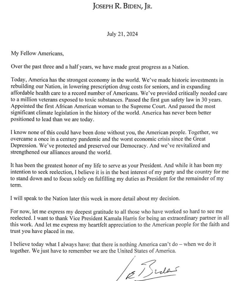 美国总统乔·拜登在周日突然宣布退出2024年总统大选,这一决定立即引发政治地震。拜登在声明中表示,这一决定是"为了党和国家利益",并在社交媒体上明确表态支持副总统卡马拉·哈里斯接替其成为民主党候选人。这一戏剧性转折发生在民主党全国代表大会召开前夕,为美国大选格局带来巨大变数。