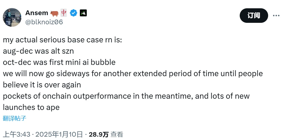 加密KOL Ansem指出,去年8月至12月期间山寨币市场经历了一轮活跃期,其中10月至12月更是出现了首轮AI代币的迷你泡沫。他认为市场将进入一段较长的横盘整理阶段,直到投资者普遍认为本轮牛市已经结束。尽管如此,他仍强调在横盘期内,部分链上项目依然可能表现突出,同时也会涌现出许多值得关注和参与的新项目。