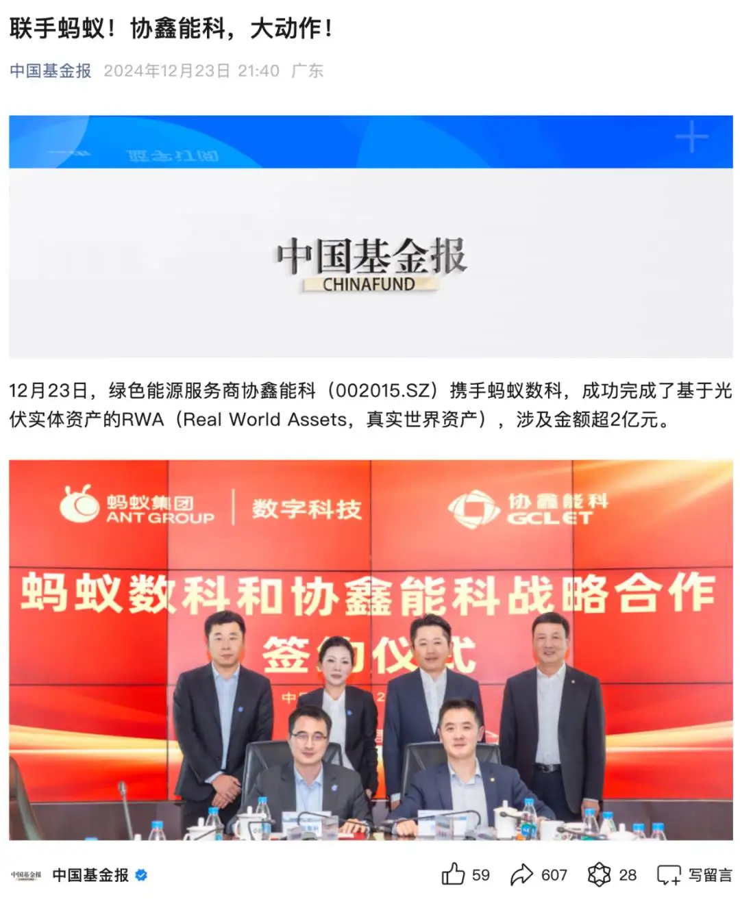 2024年12月,蚂蚁数字科技与协鑫能科合作完成国内首单基于光伏实体资产的RWA项目,涉及金额超2亿元。该项目以湖北、湖南两省的82MW户用光伏电站为锚定资产,通过区块链与物联网(IoT)技术融合,将电站运营数据及收益权打包形成数字通证。蚂蚁数科作为蚂蚁集团独立科技板块,与协鑫能科签署战略协议,拟在分布式光伏、储能、绿色金融及人工智能等领域深化合作,探索数字产业化与产业数字化融合路径。