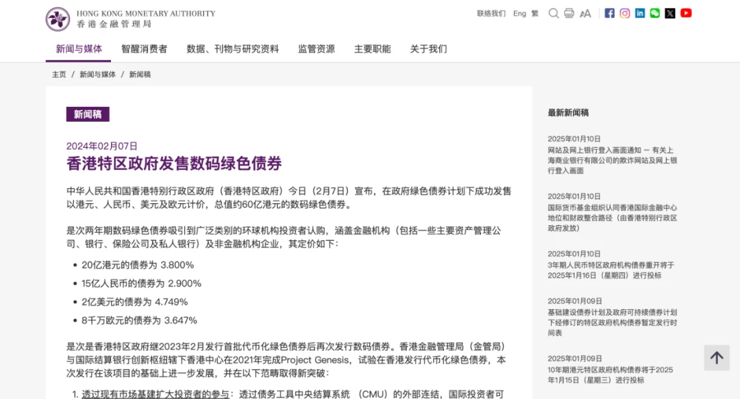 2024年2月7日,香港特区政府成功发售全球首批多币种数码绿色债券,总值约60亿港元,涵盖港元、人民币、美元及欧元。该批债券基于香港金管局与国际结算银行创新枢纽合作的Project Genesis项目进一步发展,在投资者参与、发行效率、标准化及信息披露四方面取得突破。结算及交收依托CMU系统,采用汇丰银行的HSBC Orion作为数码资产平台,多家国际金融机构参与发行筹备。