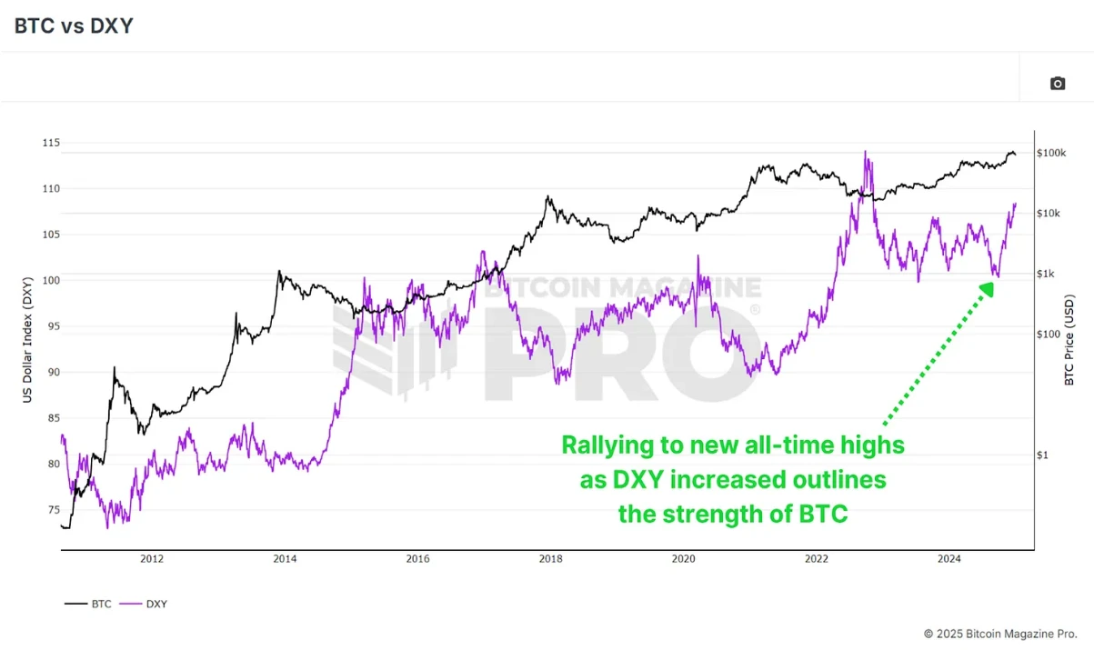 尽管2024年美元指数(DXY)走强,比特币依然表现强劲,这打破了历史上比特币与DXY通常呈现的反向关系。如果DXY的强势出现逆转,可能进一步推动比特币的上涨空间。