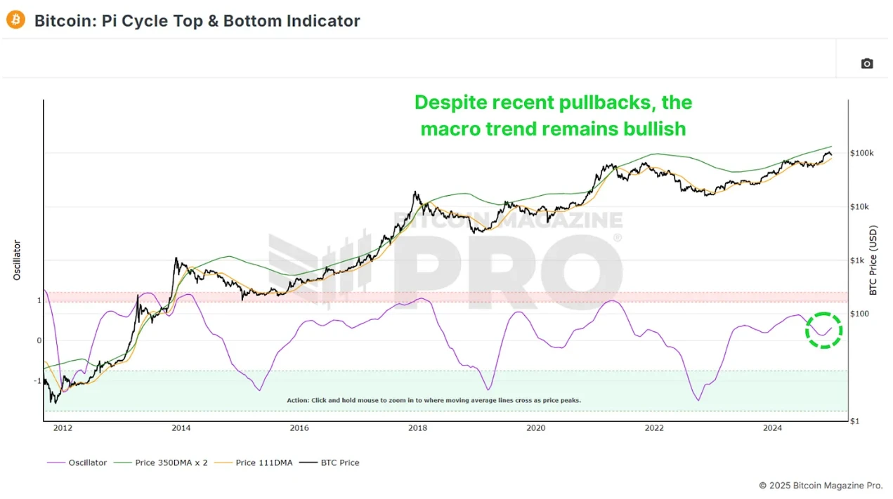 从链上数据到宏观指标,多个维度共同指向2025年比特币的看涨共识。MVRV Z-Score显示市场仍处于早期增长阶段,与2017年5月水平相当,意味着存在数百个百分点的潜在涨幅空间。PiCycle Oscillator的双均线距离再次扩大,表明看涨动能正在恢复,尽管2024年经历了多次横盘整理,已显示出进入更强增长阶段的信号。