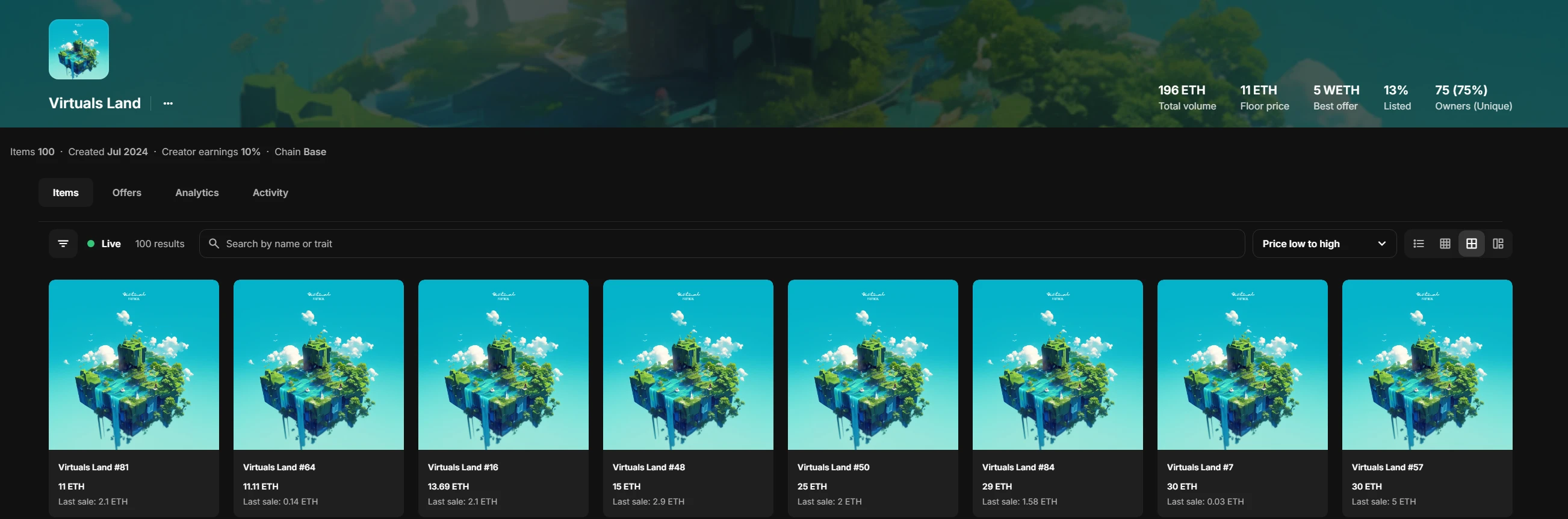 Virtuals World是Virtuals官方于2024年7月推出的Free Mint土地NFT系列,总量仅100枚,无白名单限制。