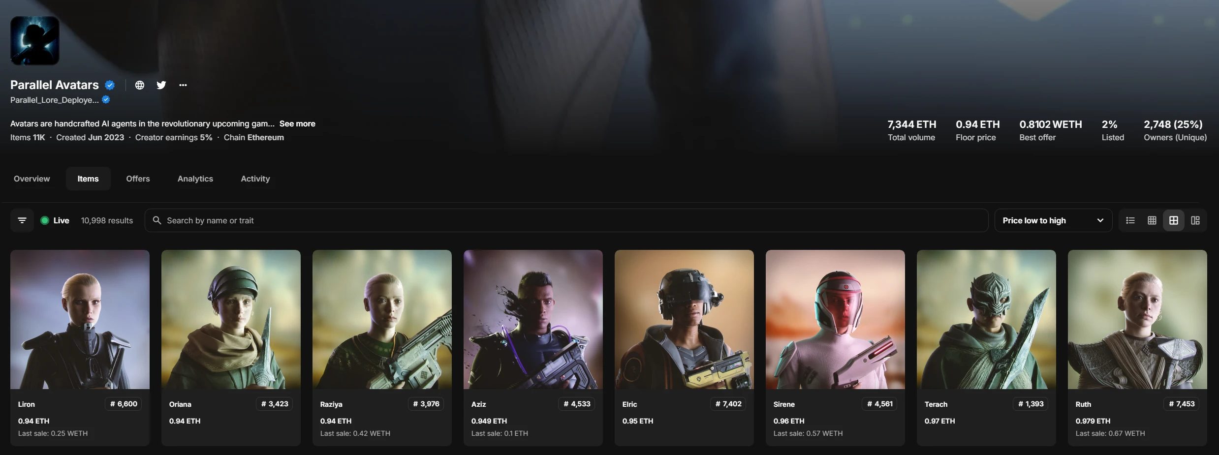 玩家可通过向 AI 代理下达任务,由其自主执行,并与其他 AI 或玩家互动,甚至进行链上交易。初始 AI 游戏角色需通过 Parallel Avatars 创建,未来也将开放普通玩家获取 AI 代理的机制。该系列 NFT 地板价约为 1 ETH,直接关联游戏核心资产。游戏预计在今年第一季度开启测试,展现出团队在 AI 游戏领域的深度布局。