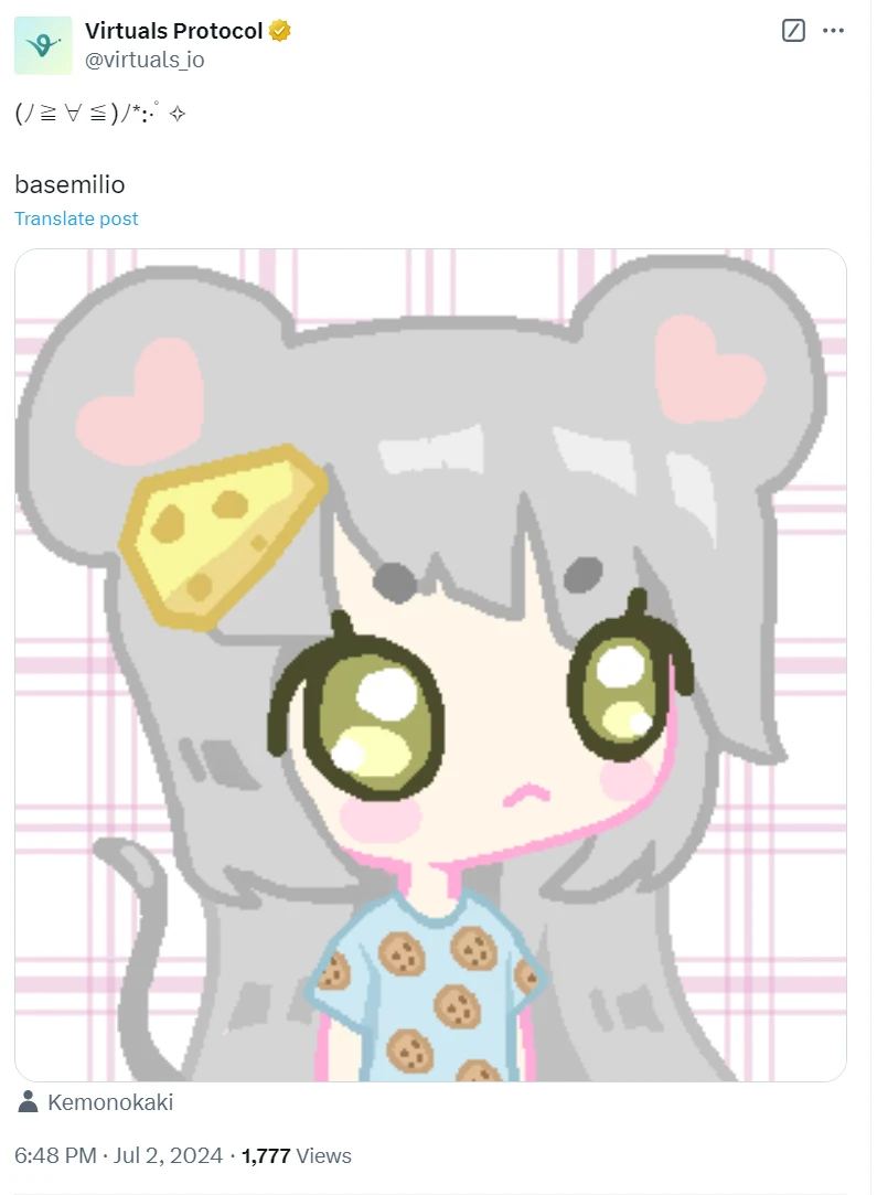 另一个值得注意的点是,早在 2024 年 7 月,Virtuals 官方推特就曾推荐过 Kemonokaki,进一步巩固了其在 Base 生态中的对标 Milady 的市场地位。