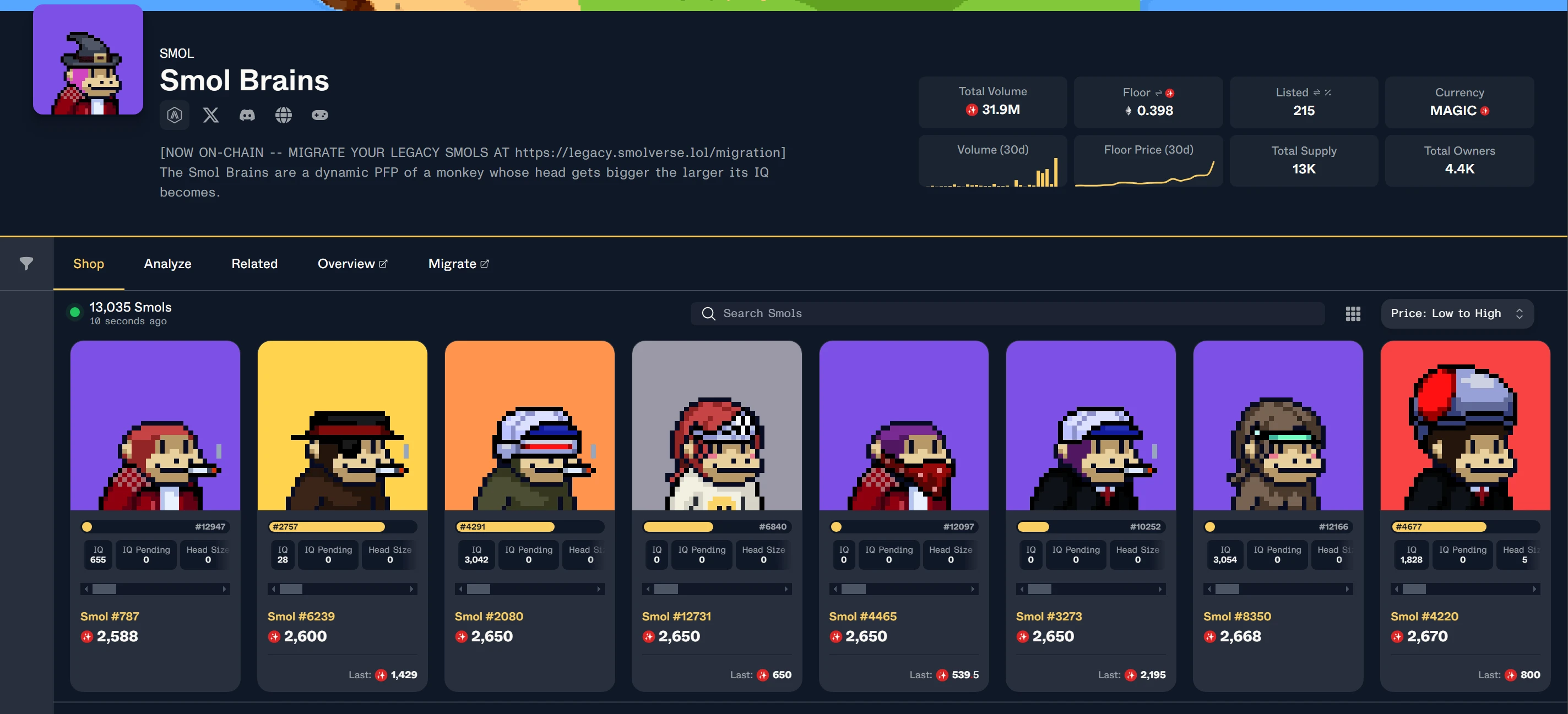 Smol Brains,也被称为「魔法猴」,是Treasure DAO生态中的核心PFP项目,属于上轮周期就已存在的老牌NFT。近期,该项目迎来显著上涨,地板价在一周内暴涨4倍,达到0.4 ETH。