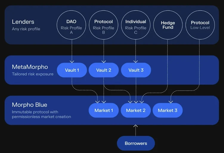 作为新兴借贷协议,Morpho在2024年第四季度表现突出。其核心产品Morpho Blue允许用户无需许可即可创建独立借贷市场,满足多样化风险需求。MetaMorpho则进一步允许贷款人创建定制化金库,将存款分配到一个或多个市场中。