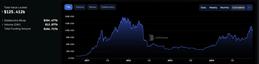 2024年,DeFi领域迎来强劲复苏。随着比特币突破10万美元以及美国政策环境改善,市场对借贷、交易和稳定币的需求显著增长,推动DeFi总锁仓价值(TVL)大幅上升。从11月6日到12月15日,DeFi的TVL从870亿美元增长至1300亿美元,涨幅超过50%,显示出市场资金正加速流入这一领域。