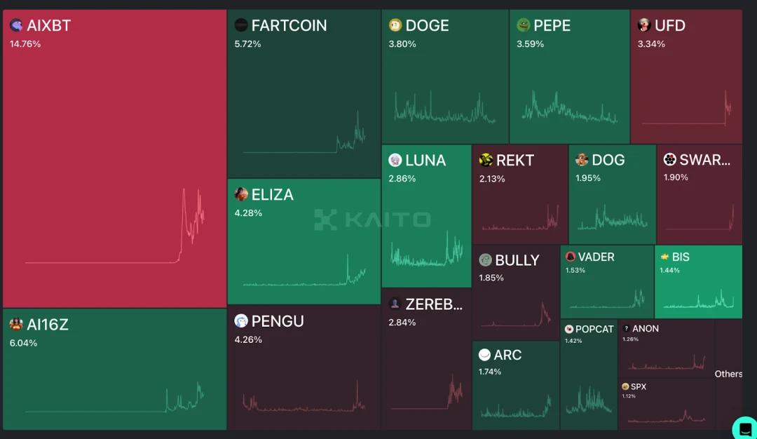 市场分析类AI代理通过抓取和解析社交媒体、新闻论坛和链上数据,为用户提供实时情绪分析和趋势预测。aixbt是其中的典型代表,它监控400多位Twitter KOL的发言,识别市场热点并发布实时洞察。持有一定数量代币的用户还可以访问其高级分析平台。