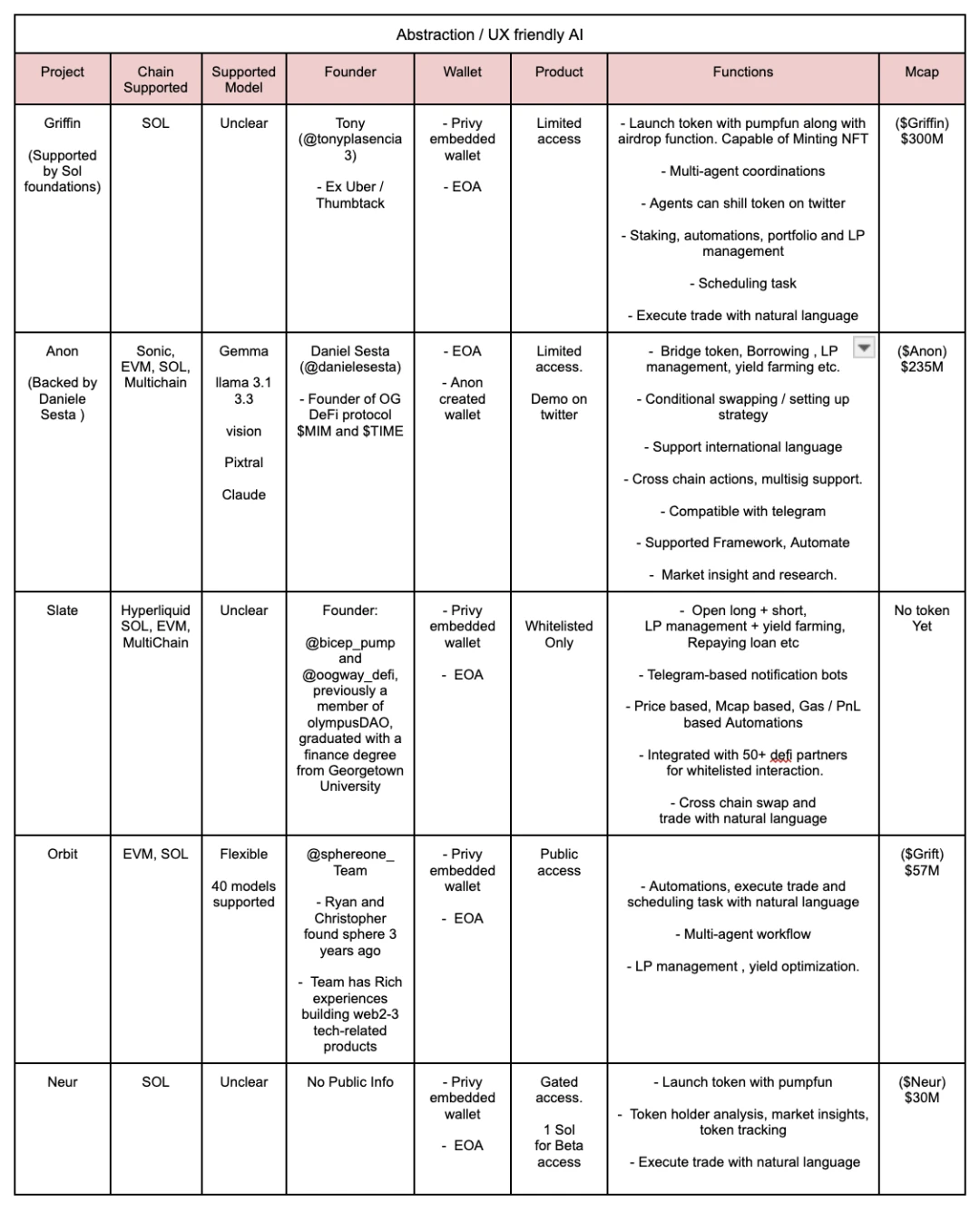以下为Griffain、Anon、Slate等主流抽象AI项目在跨链支持、钱包集成及核心功能上的对比: