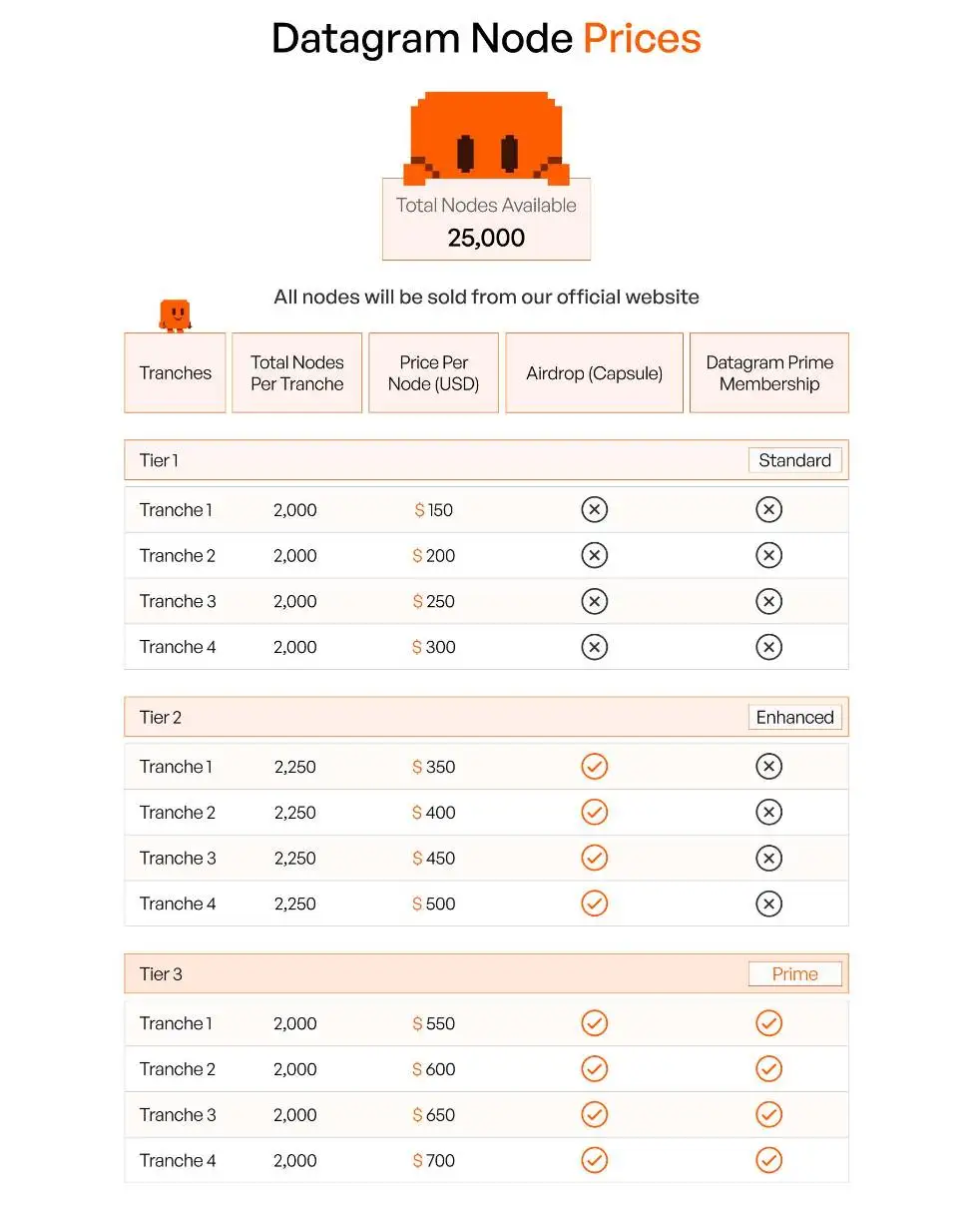 激励机制采用“性能驱动+权益分层”模式:核心节点许可分标准版、增强版与尊享版三级,对应差异化权益。例如尊享版持有者可解锁专属NFT权益(Capsule)及一年期高级会员资格,享受新产品优先体验、VIP活动邀请等特权。激励代币美元DGRAM的50%总量(500亿枚)用于奖励节点贡献,结合节点激活与持续运行奖励,避免短期投机,保障网络长期稳定。