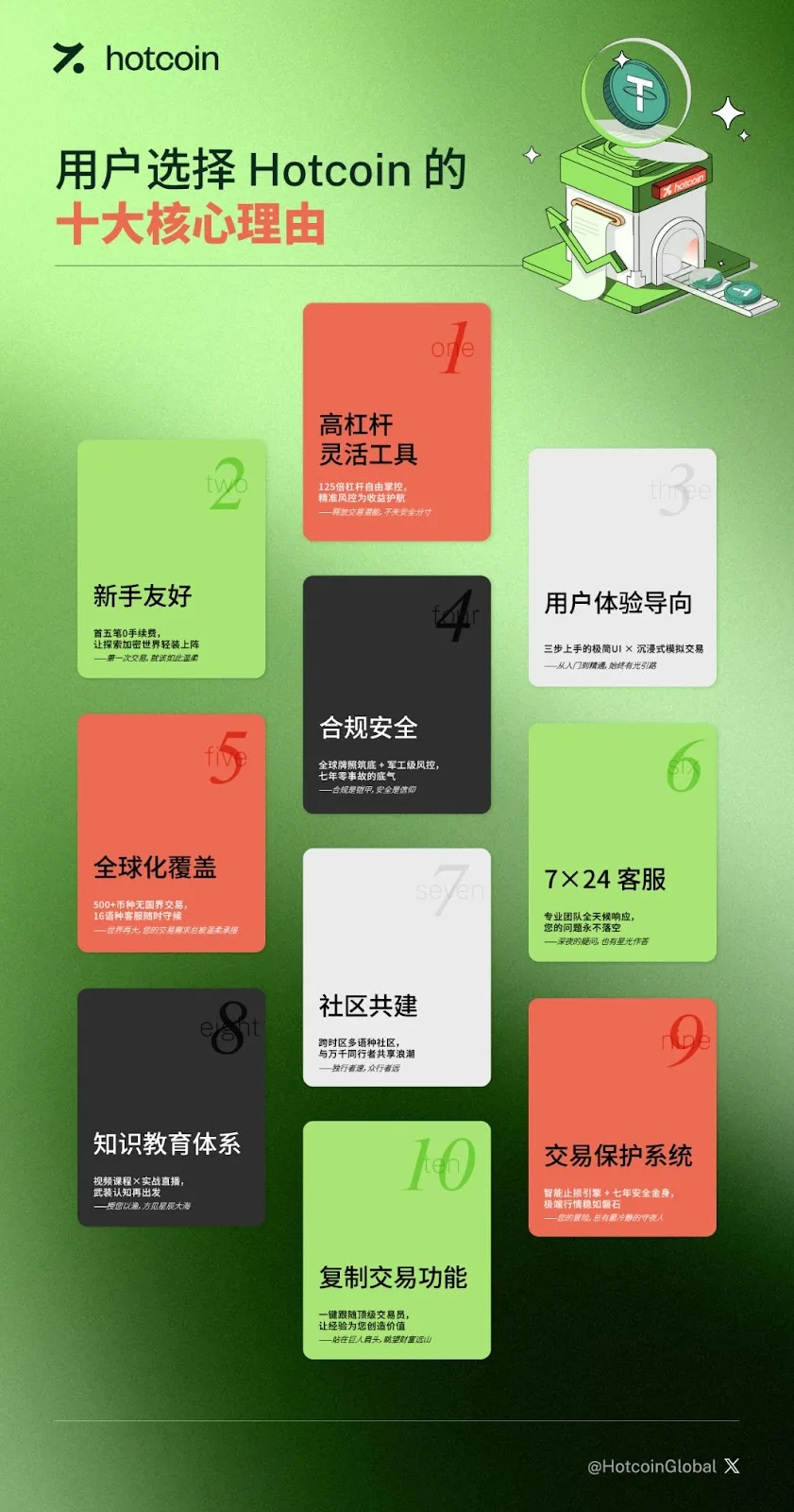 用户运营层面,Hotcoin强调从“功能优势”到“品牌价值”的转化。其总结的十大用户选择理由,涵盖合规资质、产品线丰富度、技术稳定性等维度,将零散功能点整合成系统化信任背书,强化用户对“专业、安全、透明”品牌形象的认知。