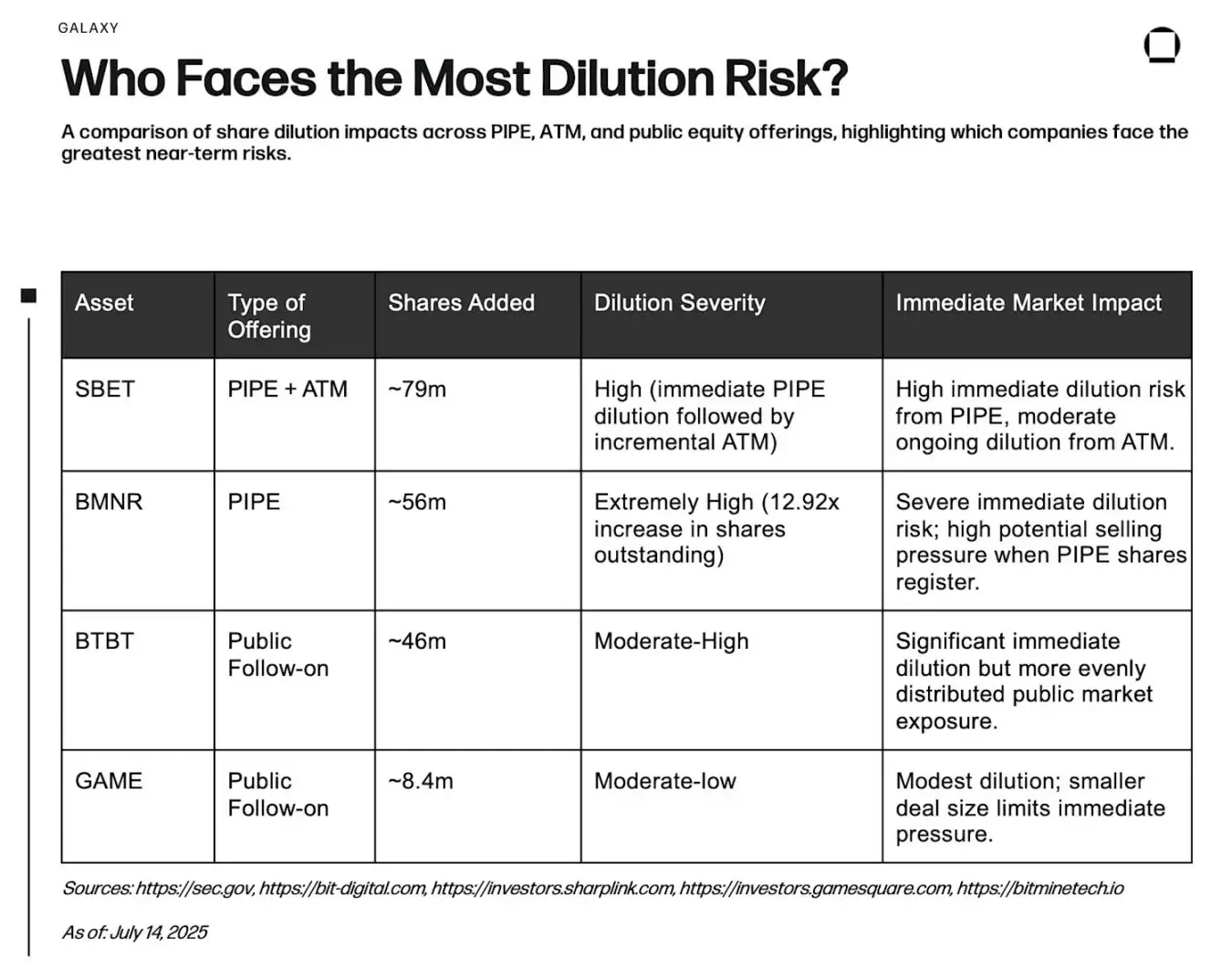 股权融资虽避免债务风险,但大规模发行新股可能稀释现有股东权益。BitMine通过私募发行5560万股,股本增幅达13倍,短期面临股价波动压力;SharpLink的PIPE与ATM组合则带来持续稀释预期。相比之下,Bit Digital与GameSquare采用传统公开发行方式,稀释节奏更透明,市场接受度相对较高。投资者需通过“以太坊集中度”指标(每千股对应持仓量)横向比较不同公司的敞口与稀释平衡能力。