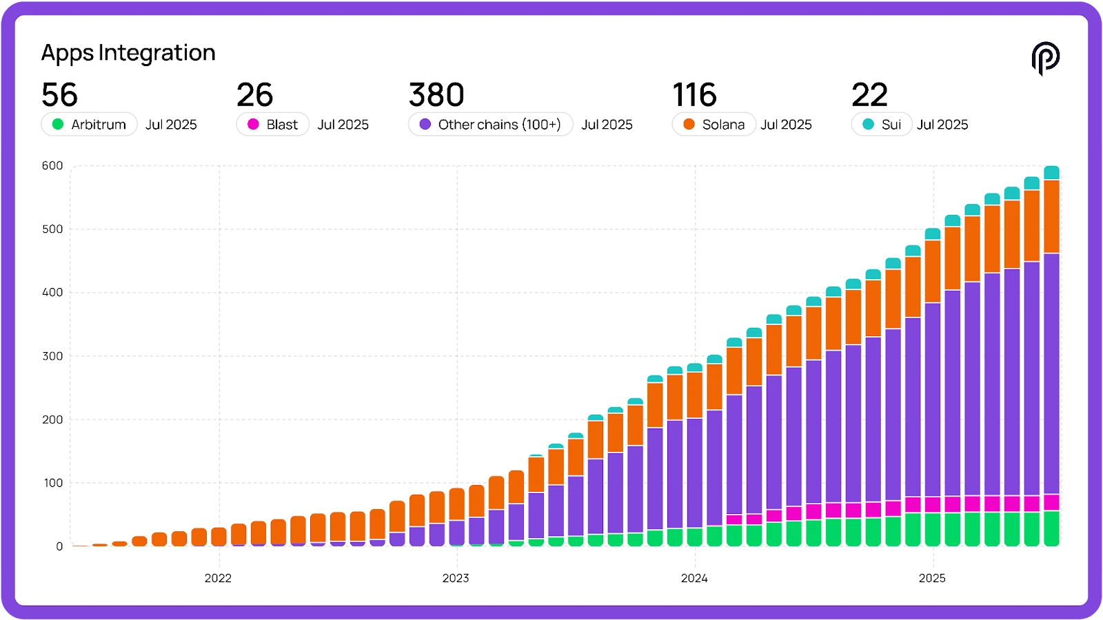 发展早期,Pyth聚焦去中心化金融(DeFi)领域验证技术可行性与市场需求。通过集成600多个协议、覆盖100多条区块链,建立庞大数据分发网络,提供1800多个价格馈送,其中900多个为现实世界资产数据。凭借在DeFi衍生品领域60%以上的市场份额及累计超1.6万亿美元交易量,Pyth确立链上数据“真实来源”地位。