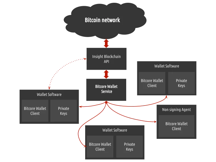 Bitcoin Core QT客户端是一个集成在完整节点中的钱包实例。该钱包使用完整节点的内部API和数据存储,以获取区块链状态并广播交易。