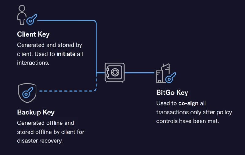 - 私钥 2:也叫 BitGo 私钥。由 BitGo 团队持有。用于签名由客户端发来的交易。在签名前 BitGo 会检查交易是否满足所有的使用条款。