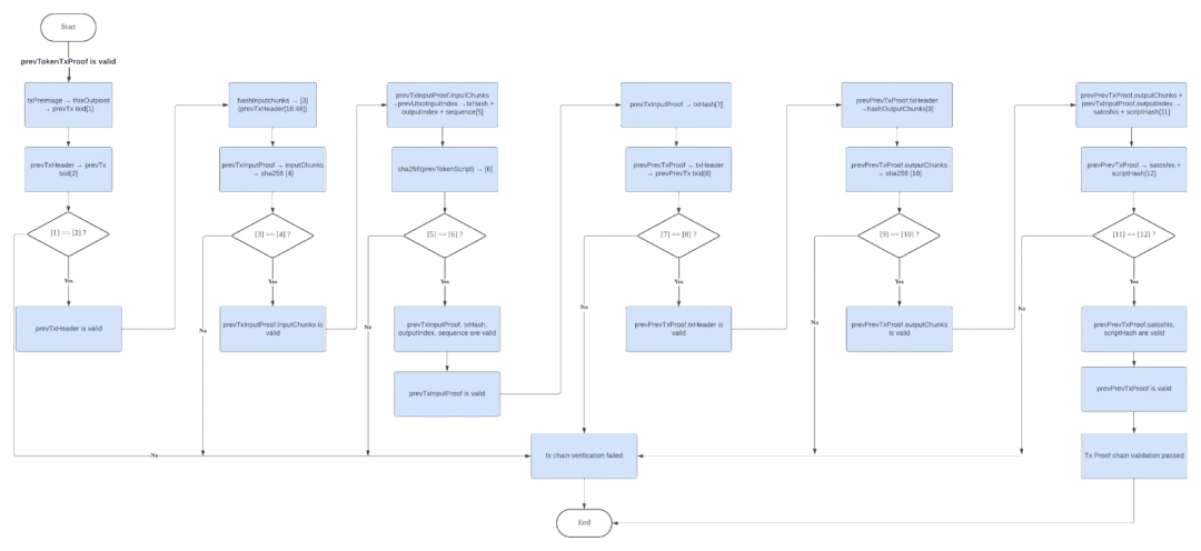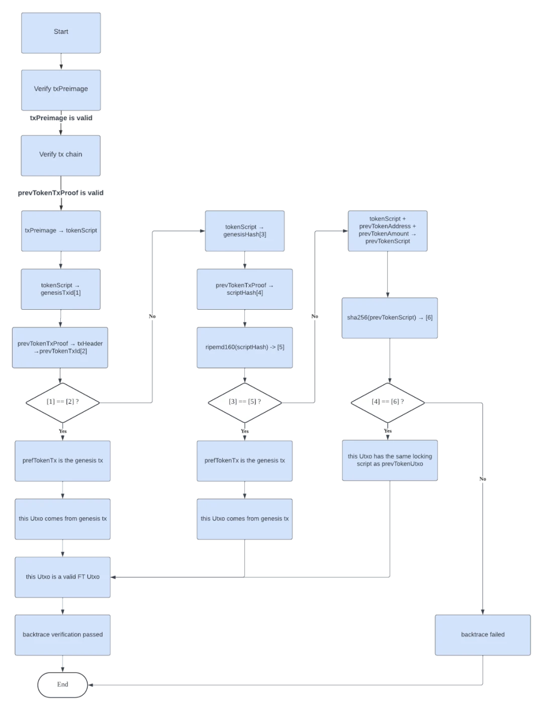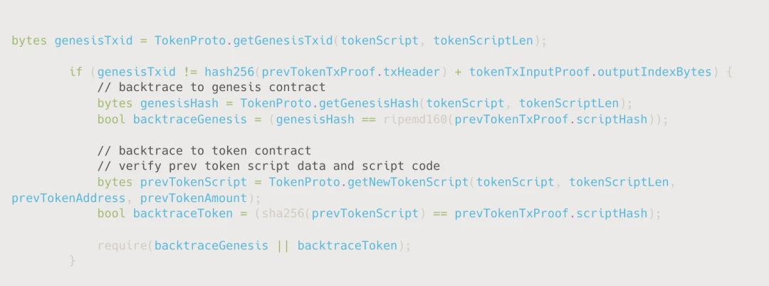 通过验证UTXO的锁定脚本代码段是否与前一个UTXO匹配,确保代币历史真实连续。