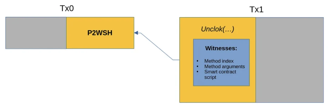 左侧表示输入,右侧表示输出的交易结构,形象展示了P2WSH部署机制及合约调用时的交易结构。