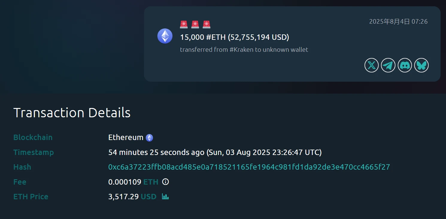 Whale Alert监测数据显示,8月4日,Kraken交易所于约55分钟前发生15,000枚以太坊转移至未知钱包的链上活动,该笔资金估值达5,275.52万美元。