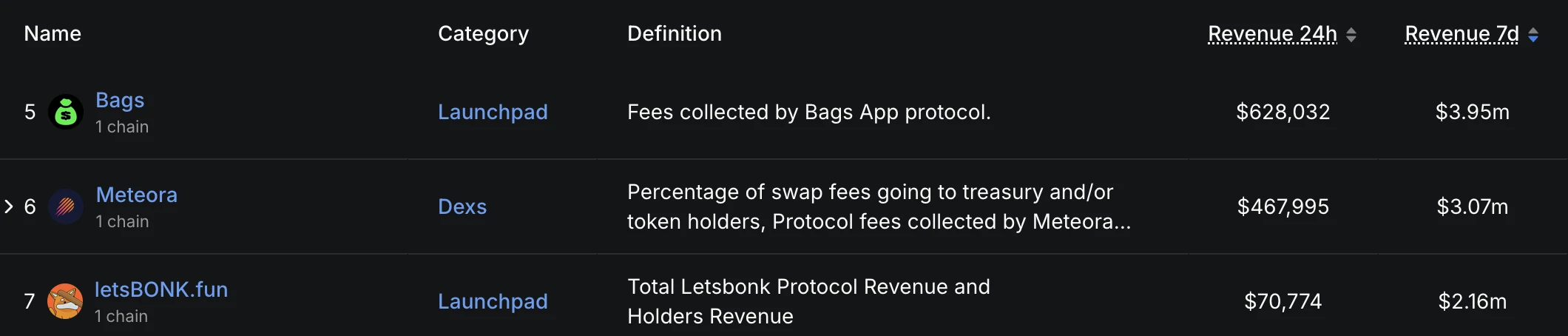 Solana生态Memecoin平台BAGS七日收入超letsBONK.fun