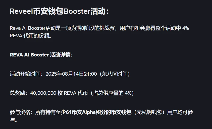 币安钱包8月13日宣布启动Reveel(REVA)代币的Pre-TGE预售及Booster双轨活动。预售机制面向符合条件的用户开放,允许其在REVA正式交易前参与优先认购;Booster计划则通过阶段性任务完成度与项目早期支持力度,分配总计四千万REVA空投奖励。