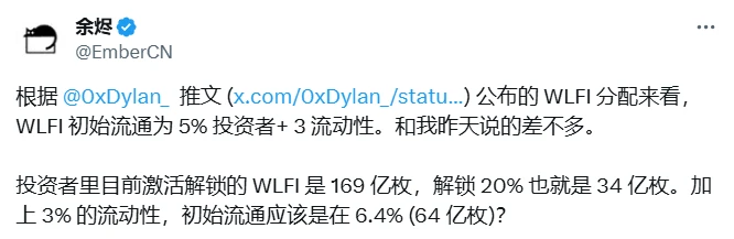 WFLI项目方于9月1日通过官方社交媒体披露代币分配方案:8%分配至Alt5上市公司(锁定状态),10%预留未来激励计划及积分(已锁定),团队及机构投资者份额已锁定,3%用于CEX流动性及DEX LP流动性供应,5%分配给投资者。项目方特别说明,当前流通部分仅包含交易所流动性、DEX LP及5%投资人份额。据分析师余烬测算,WLFI初始流通量由5%投资人(已激活解锁169亿枚中的20%,即34亿枚)及3%流动性共同构成,预计流通比例约为6.4%(对应64亿枚)。