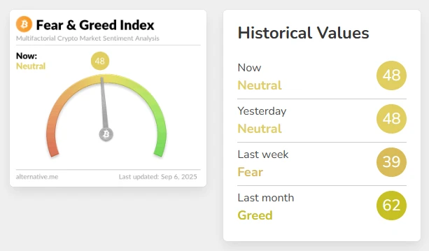 加密货币恐慌与贪婪指数9月6日录得48,连续多日维持中性区间,市场情绪未现明显波动。