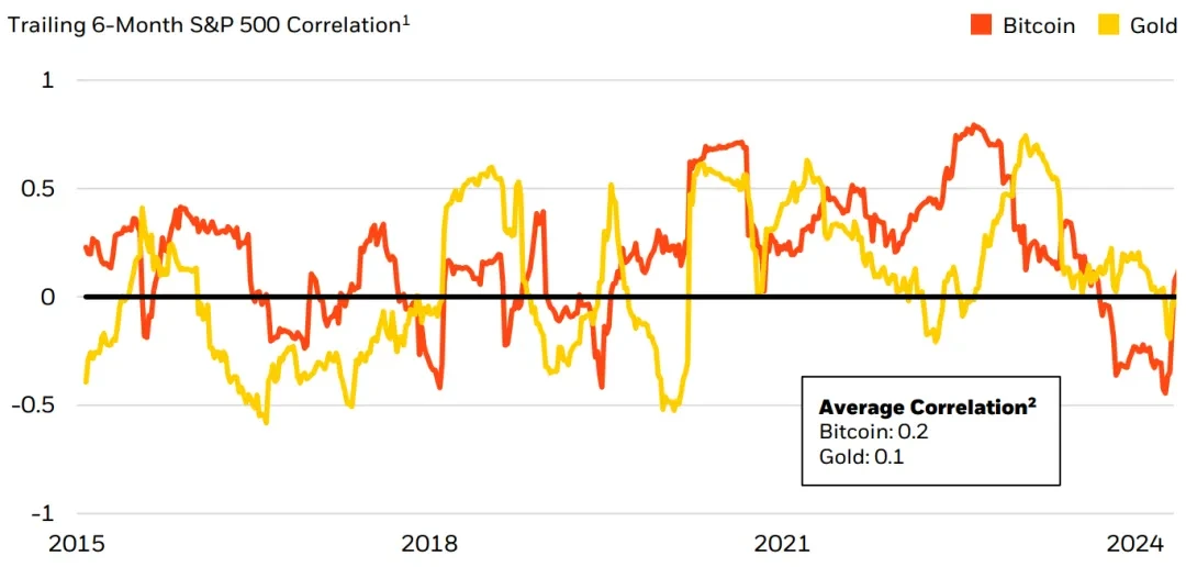 数据显示,比特币与美股和黄金保持着长期的低相关性。根据2015年至2024年的统计,比特币与标普500指数的6个月滞后相关性始终维持在较低水平。即便在美元实际利率或流动性突然变化的短期窗口期,这种相关性上升也只是暂时现象,未能形成统计学上显著的长期关联。这种特性使得比特币在传统投资组合中展现出独特的分散价值。