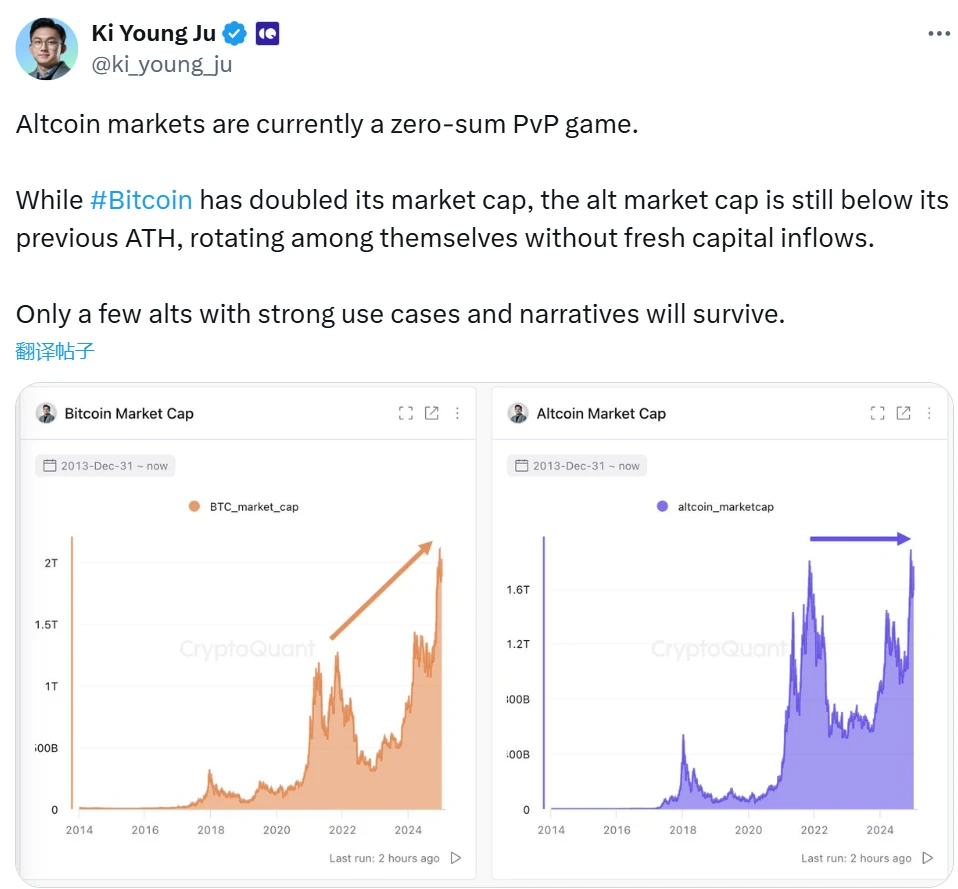CryptoQuant首席执行官Ki Young Ju指出,山寨币市场已演变为一场零和的PvP(玩家对玩家)博弈。尽管比特币市值实现翻倍,但山寨币总市值仍未突破历史高点。资金仅在不同项目间轮转,并未带来新的外部资本流入。在这种环境下,只有少数具备应用场景和清晰叙事的项目能够存活。