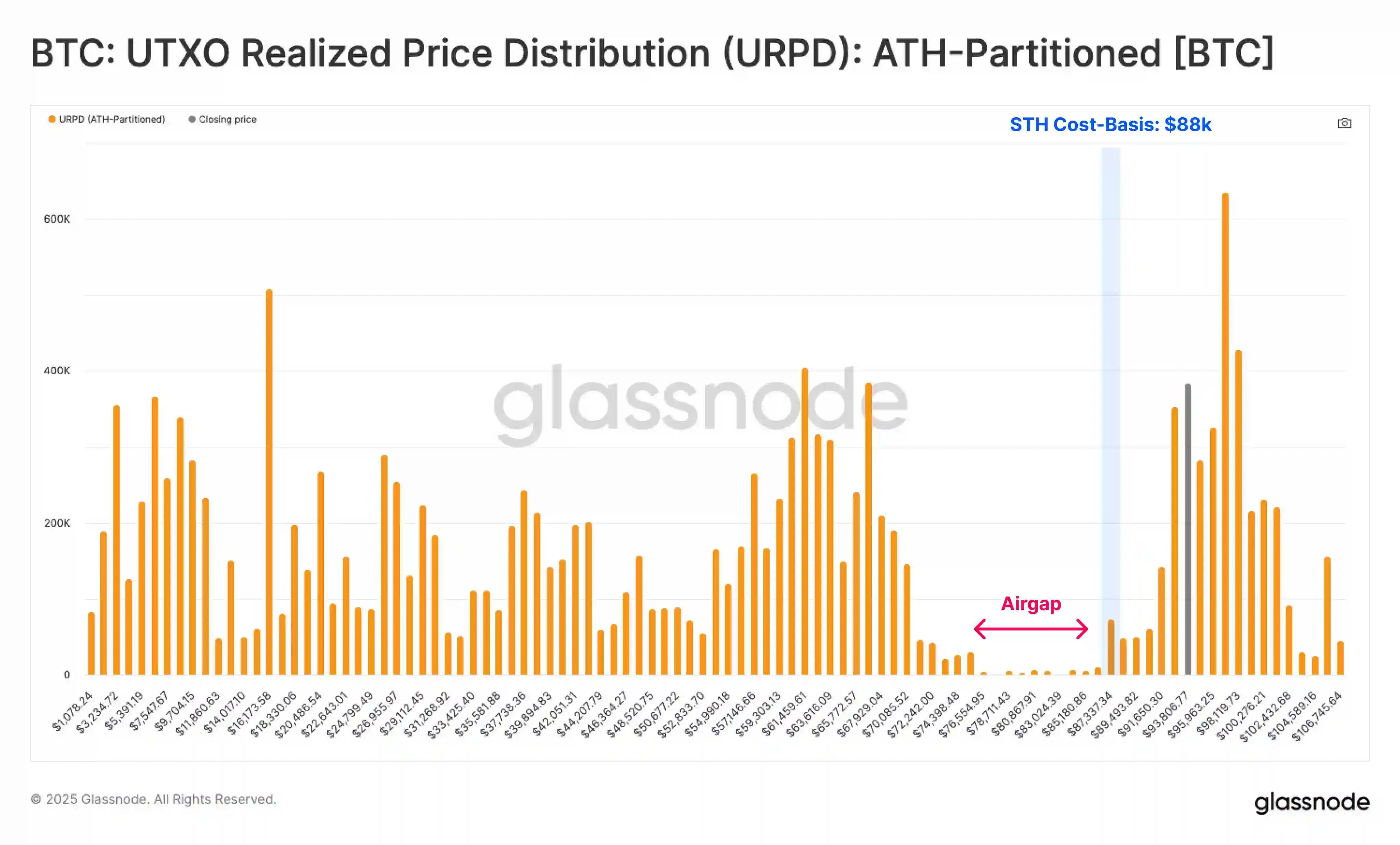 Glassnode分析指出,比特币短期持有者的成本基准位于8.8万美元,这一水平对判断价格动能至关重要。根据URPD指标分析,在该成本基准以下的交易量相对稀少,意味着一旦价格跌破这一关键防线,可能触发更大幅度的下跌趋势。