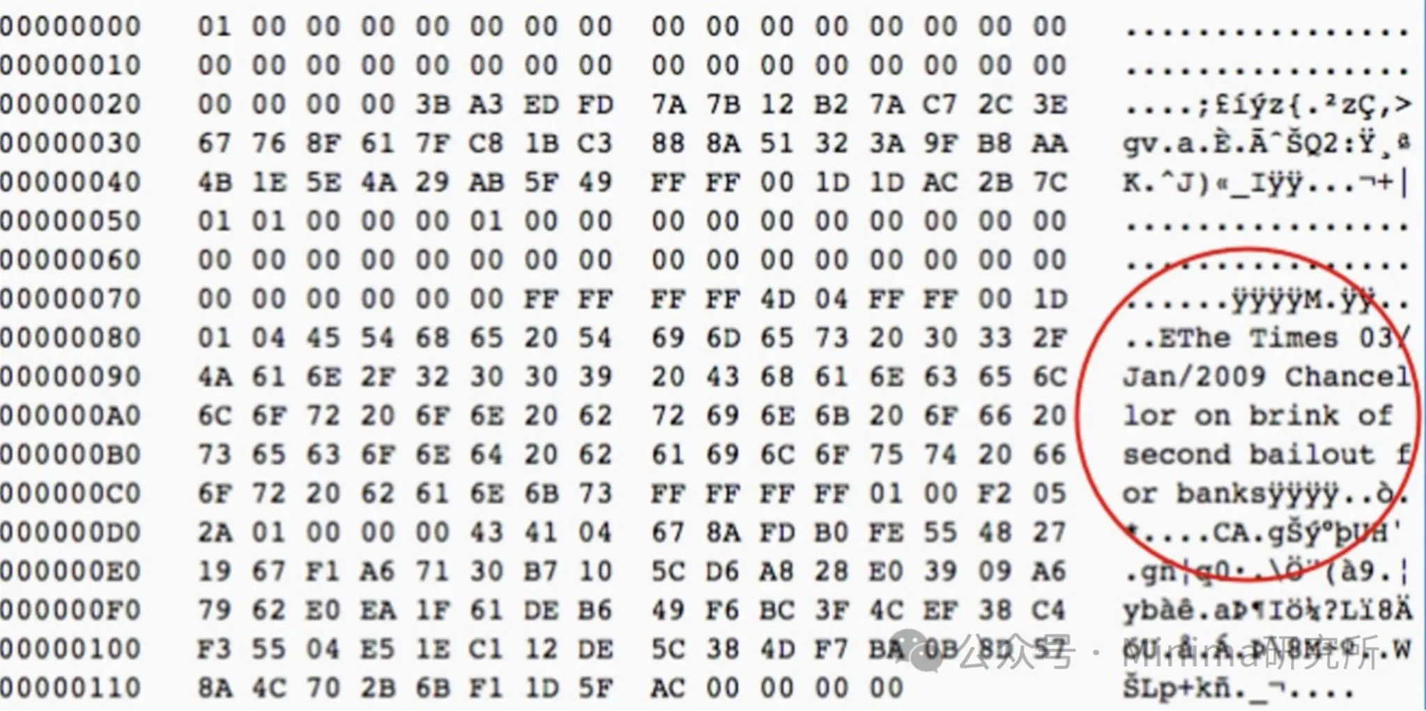 创世区块中嵌入了一条来自《泰晤士报》2009年1月3日的头条新闻:“财政大臣即将对银行进行第二次救助。”