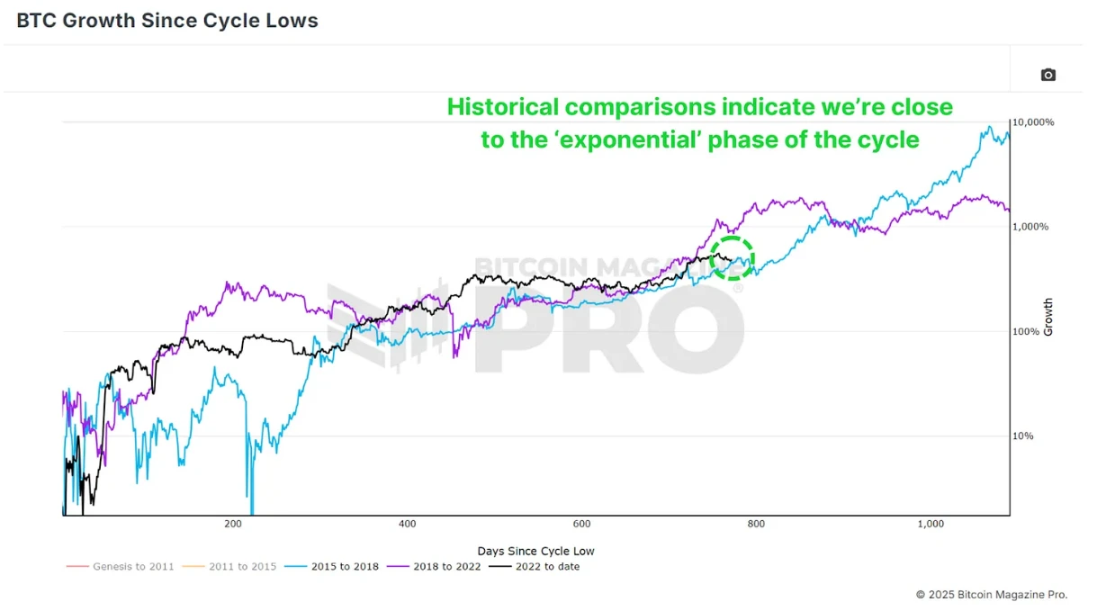 比特币价格周期通常呈现“减半后冷却”和“指数增长”两个阶段。历史数据显示,减半后的6至12个月为市场整理期,随后进入快速上升通道。我们正接近这一关键突破点,尽管涨幅可能不及早期周期,但仍具备显著增长潜力。