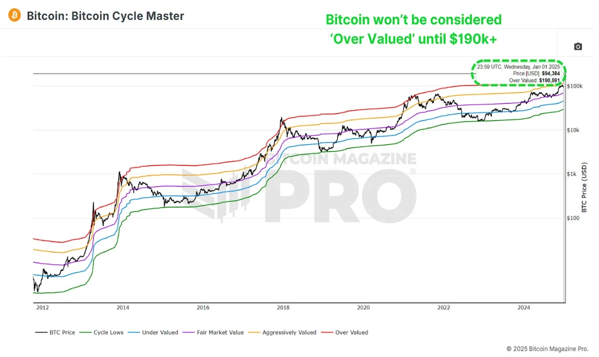从测算结果来看,价格与19万美元的过度估值区间仍有相当距离,意味着即便经历2024年的显著涨幅,比特币依然处于合理甚至偏低估的区间。这种动态上移的天花板也反映出市场基本面的持续改善,包括资金流入、网络活跃度提升和宏观环境支持等多重因素。