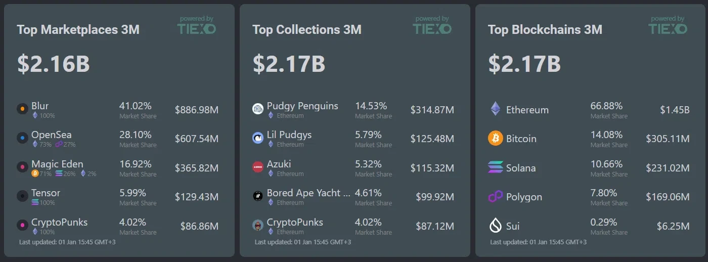根据NFT数据分析平台Tiexo的统计,Blur和OpenSea在第四季度成为两大顶级交易平台,合计占据NFT总销售额的近70%。其中,Blur以8.85亿美元的季度销售额领先市场,OpenSea则以6.07亿美元紧随其后。与此同时,专注于Solana生态的Magic Eden表现突出,录得3.65亿美元销售额,成为该生态的领跑者。