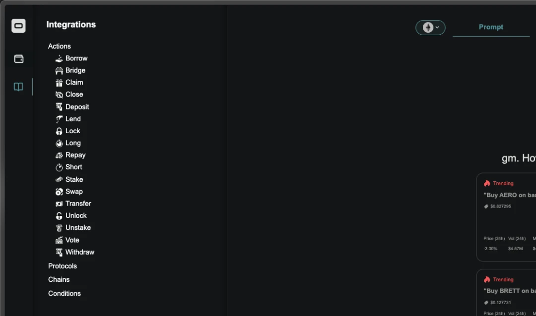 - Slate:定位于“Alpha AI”,专注跨链交易与自动化策略,是目前唯一支持Hyperliquid自动化交易的代理。功能包括EVM与Solana间跨链Swap、条件订单(如基于gas费用或价格自动执行)、多空开仓及LP管理。其钱包集成Privy嵌入式架构,用户可自行管理或授权代理操作。