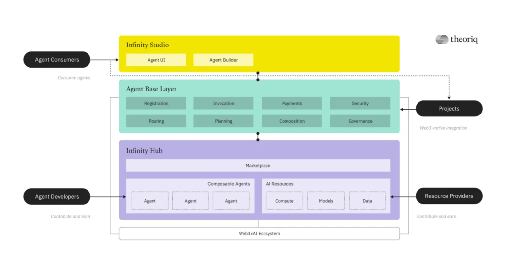 Theoriq通过蜂群系统(swarm system)和元代理(meta-agent)实现多AI协同,优化任务分配与声誉管理: